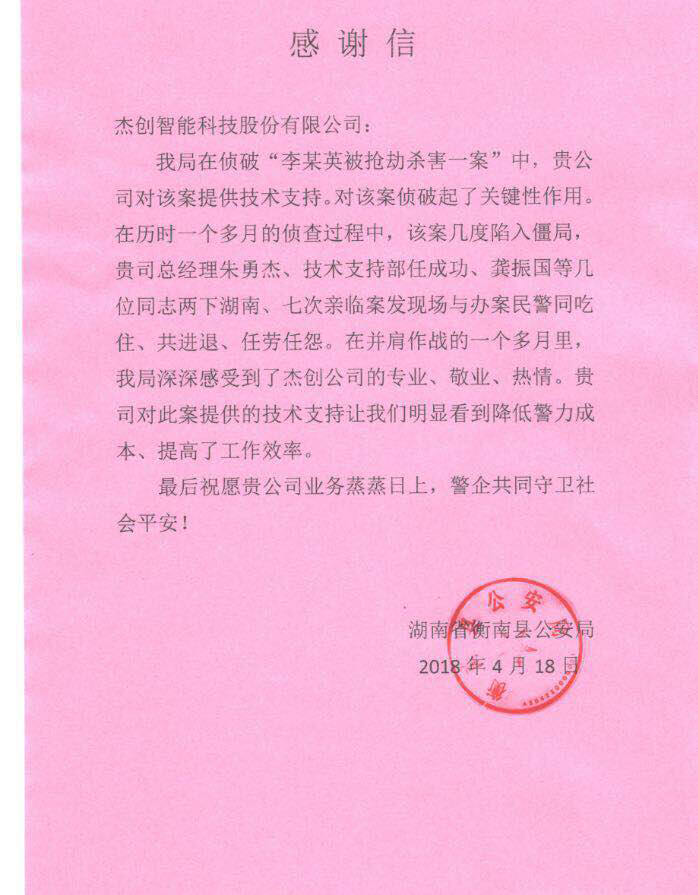 近日,湖南省衡南公安局发来感谢函,对星空电竞智能在近期协助侦破“李某英被抢劫杀害一案”表示感谢,目前相关犯罪嫌疑人已被依法刑事拘留,案件正在进一步侦办中。